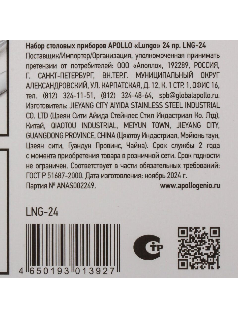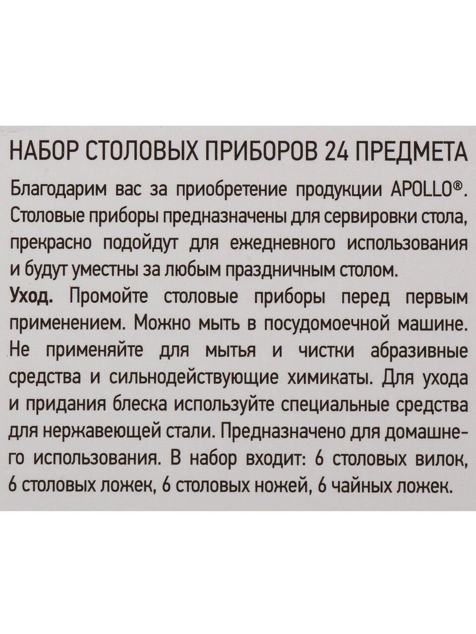 Оформите заказ сейчас и получите стильный набор столовых приборов Apollo Lungo LNG-24 по выгодной цене — надёжное качество, быстрая доставка, идеальный вариант для подарка или обновления сервировки!