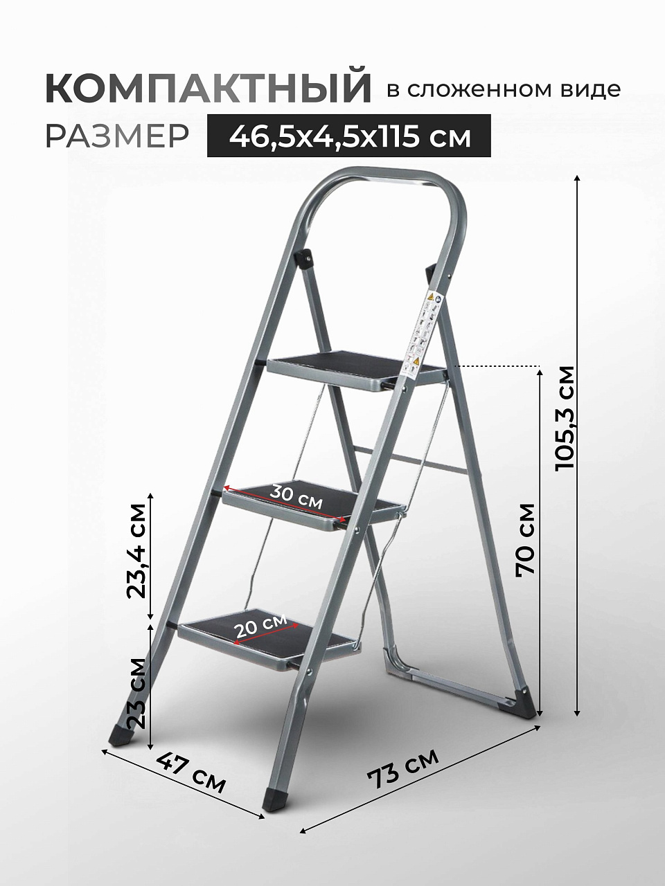 - Стремянка имеет две ступени, что делает ее удобной для выполнения работ на разных высотах. Вы можете легко достать до высоких полок, заменить лампочку или выполнить другие работы, не используя дополнительные инструменты.