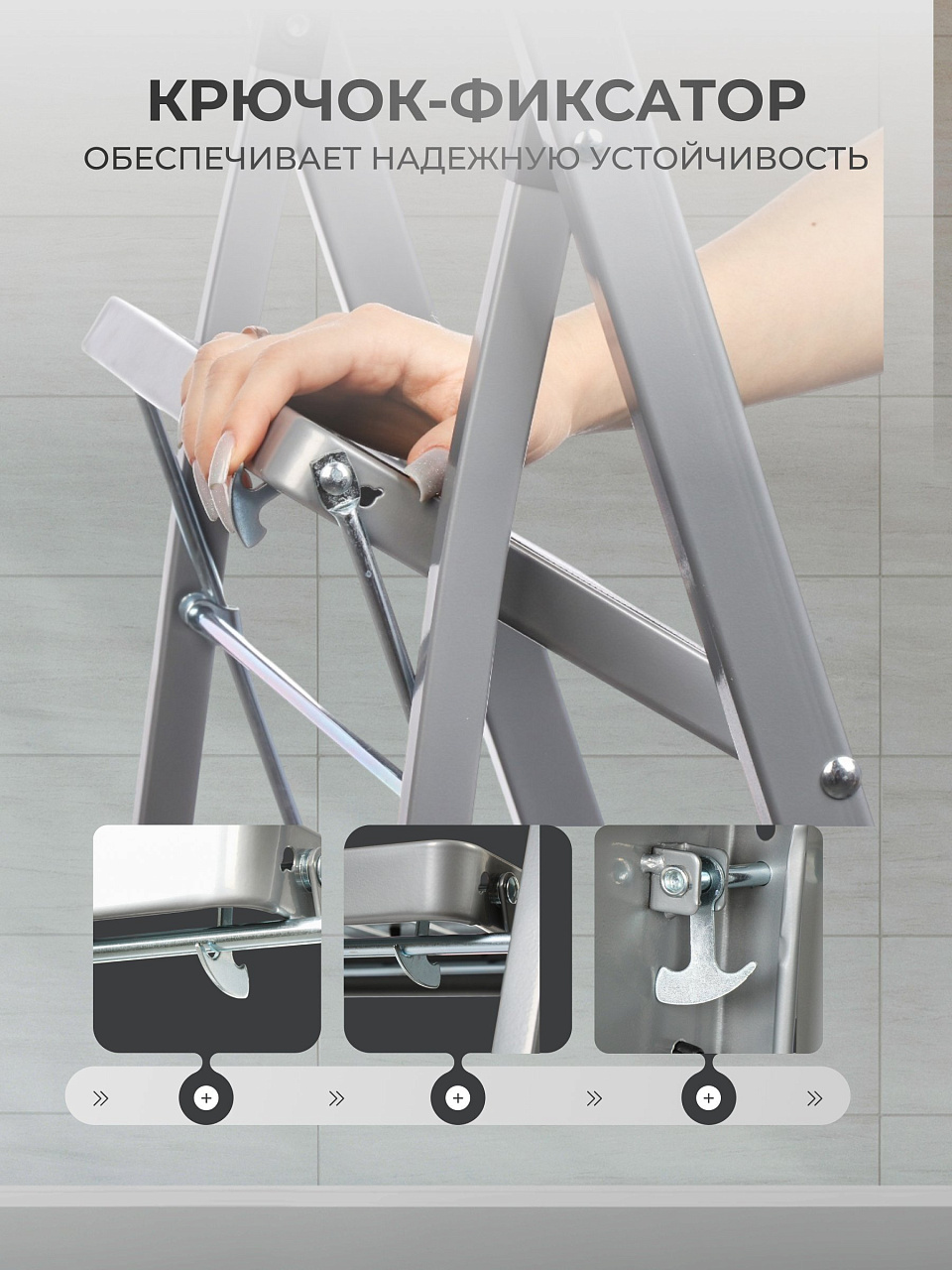 - К каркасу стремянки ступени зафиксированы на саморезы. Также у стремянки имеются металлические соединяющие опоры, при помощи которых ступени фиксируются в разложенном виде.