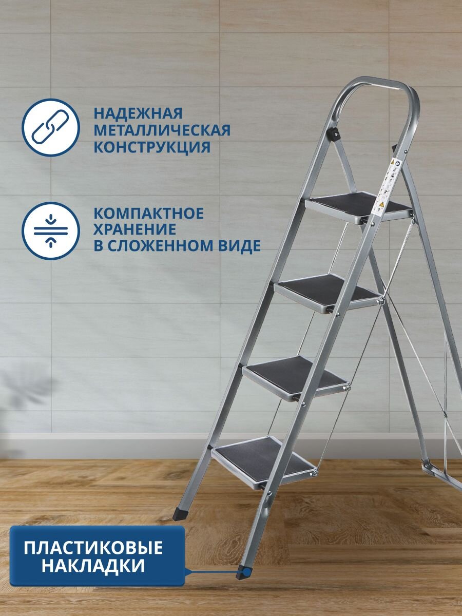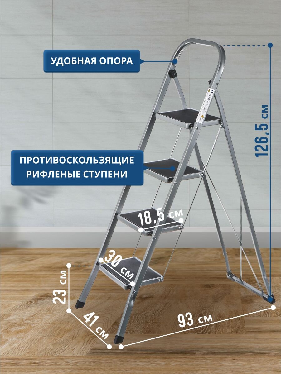 - Стремянка имеет четыре ступени, что делает ее удобной для выполнения работ на разных высотах. Вы можете легко достать до высоких полок, заменить лампочку или выполнить другие работы, не используя дополнительные инструменты.