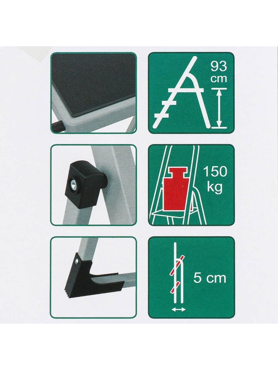 - Высокая нагрузочная способность. Стремянка может выдерживать нагрузку до 150 кг, что обеспечивает высокую степень безопасности при использовании. Вы можете спокойно стоять на ней и выполнять различные работы на высоте.