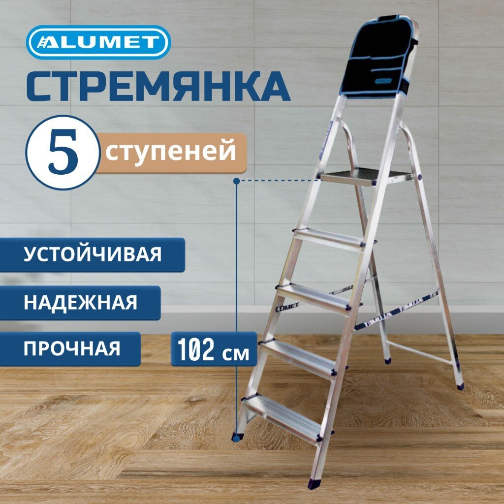 Вы можете приобрести «Стремянка 1 секция, 5 ступеней, алюминий, 1.02 м, 150 кг, рифленые ступени, Alumet, AМ705АК» и другие товары в нашем интернет-магазине в Орле по низким ценам и с бесплатным самовывозом.