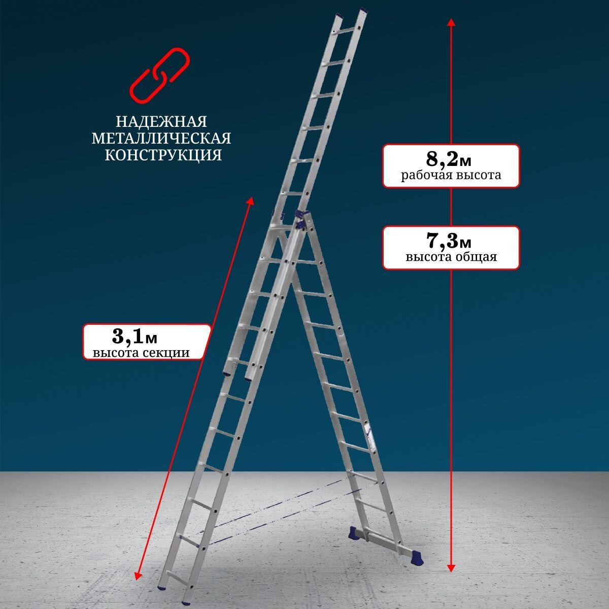 Лестница трехсекционная — это универсальная алюминиевая лестница, которая сочетает в себе сразу функции приставной лестницы, лестницы-стремянки и двухсекционной лестницы. Трехсекционная алюминиевая лестница собрала в себе все преимущества односекционной и двухсекционной лестницы. Данная лестница универсальна, состоит из трех частей и может использоваться в широком диапазоне высот. Имеется возможность использовать верхнюю секцию как отдельную небольшую приставную лестницу.