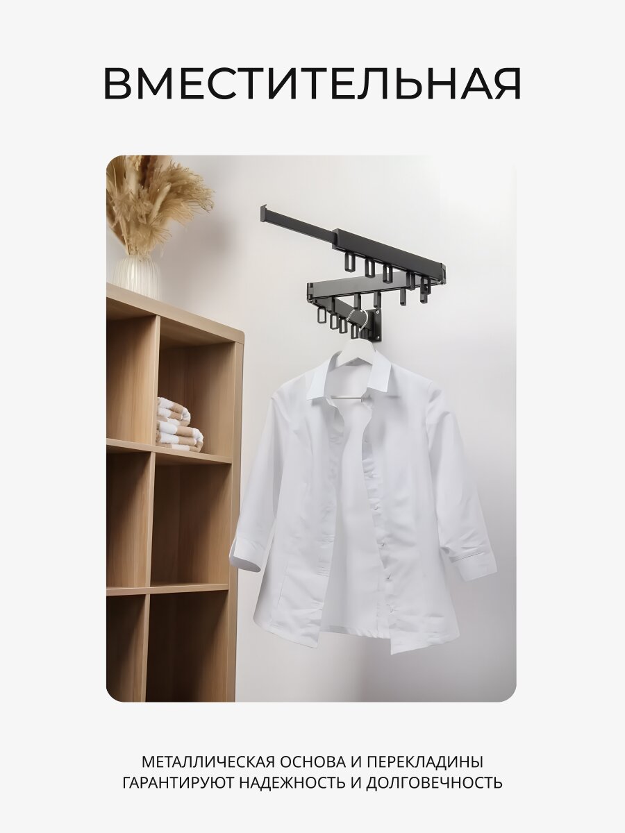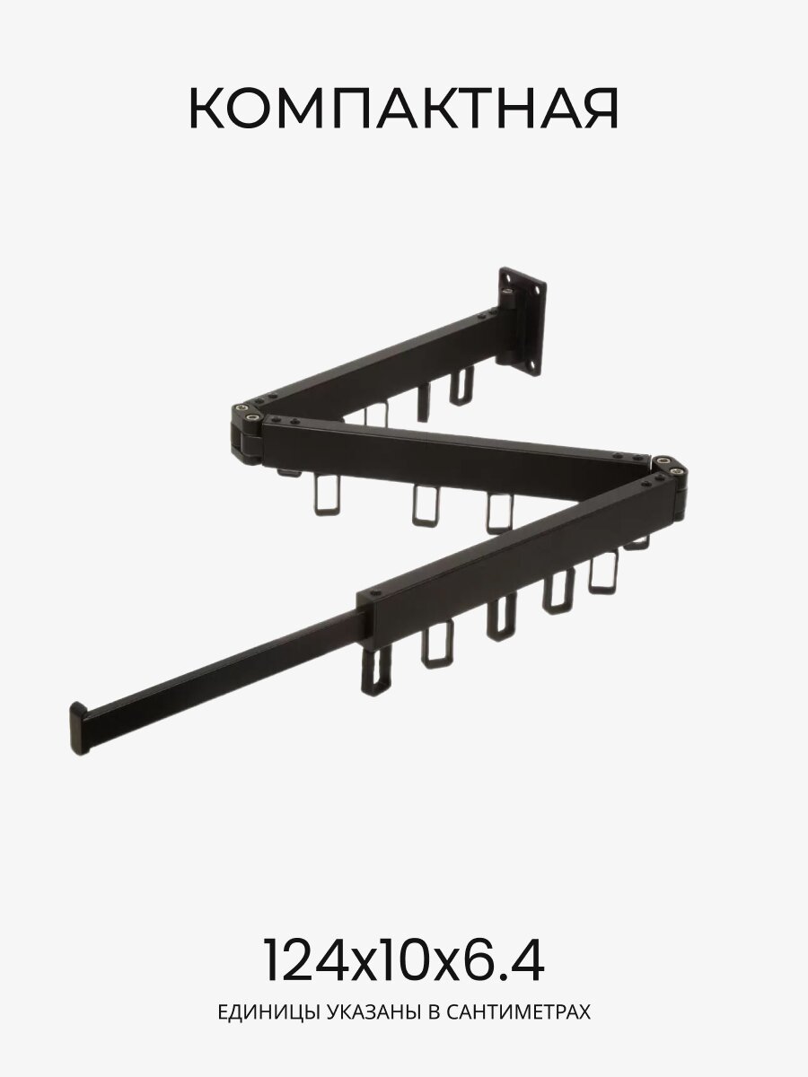 Сушилка для белья настенная складная 124х10х6.4 см — практичное решение для комфортной организации пространства в доме или на даче. Современный дизайн в черном цвете гармонично впишется в любой интерьер и подчеркнет стиль помещения. Настенное размещение позволяет экономить место, а складная конструкция обеспечивает удобство хранения и использования даже в небольших комнатах. Металлическая основа и перекладины гарантируют надежность и долговечность, выдерживая максимальную нагрузку до 30 кг, что делает сушку белья максимально эффективной и безопасной.