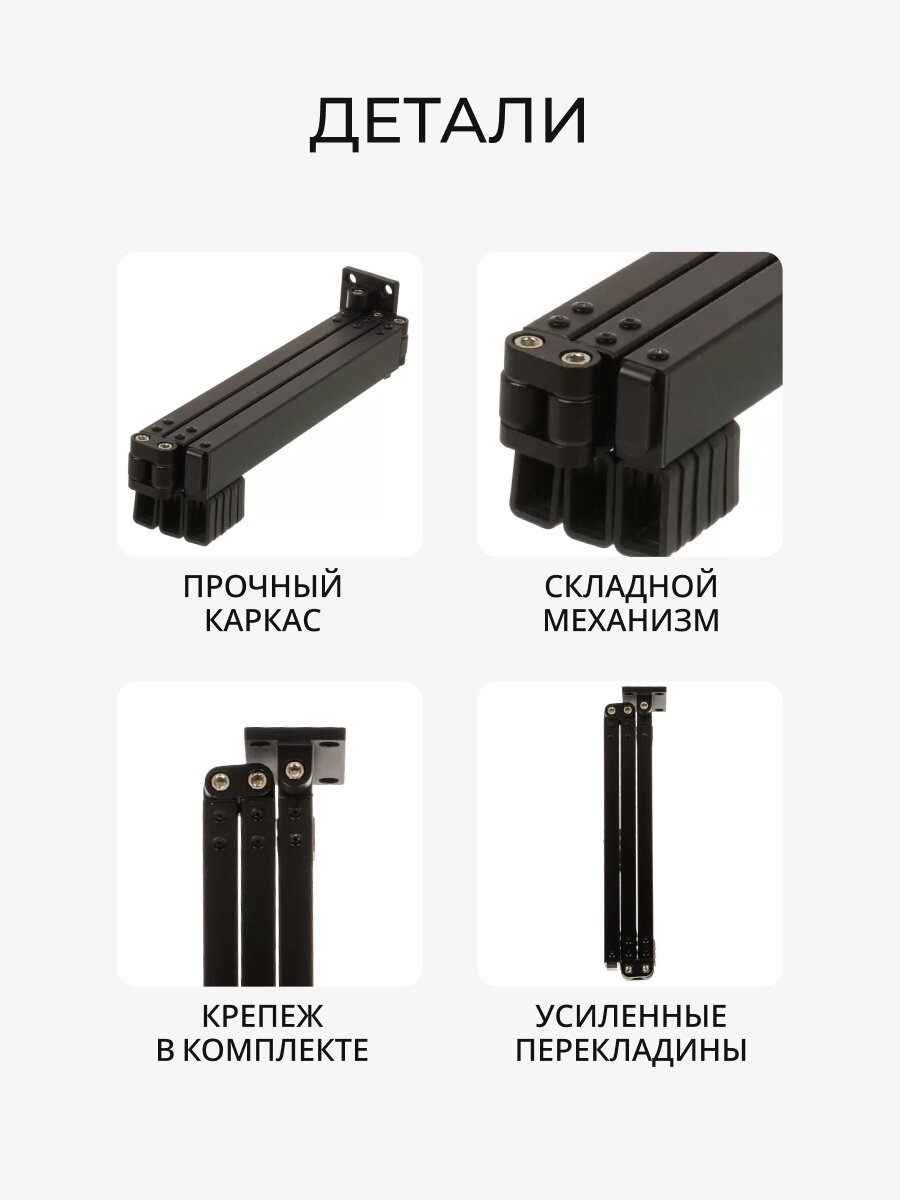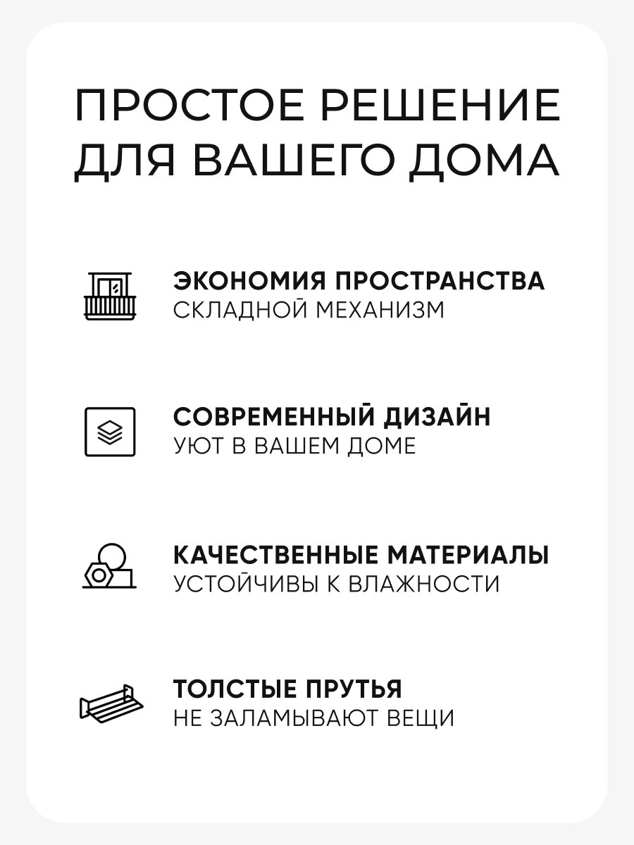 Сушилка для белья подходит для ежедневного использования в городской квартире, загородном доме или на дачном участке. Благодаря компактным размерам и эргономичной конструкции легко размещается на стене в ванной, на балконе или в подсобном помещении. Простота эксплуатации и складывания позволяет быстро подготовить пространство для сушки и освободить его после использования. Металлические элементы устойчивы к воздействию влаги, что особенно важно при частом контакте с мокрым бельем. Бренд Другие бренды гарантирует качество и надежность каждой детали.