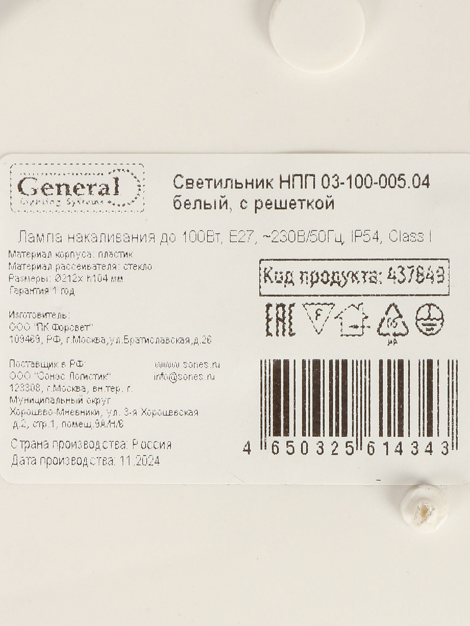 Вы можете приобрести «Светильник General Lighting Systems, НПП 03-100-005.04, 100 Вт, E27, на 1 лампочку, IP54, 21.2х21.2х10.4 см, с решеткой, белый, 437849» и другие товары в нашем интернет-магазине в Борисоглебске по низким ценам и с бесплатным самовывозом.
