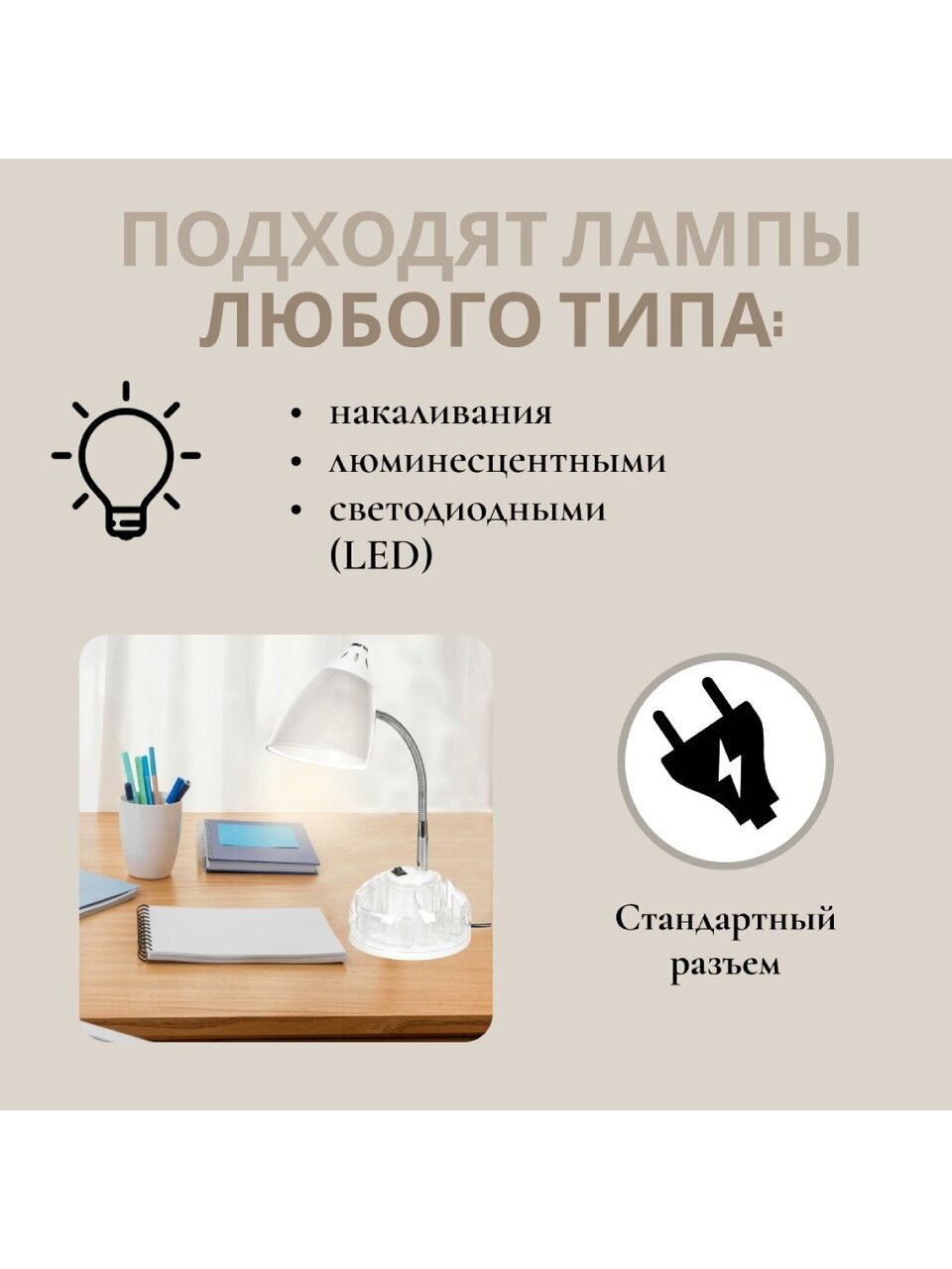 Настольный светильник под лампу с цоколем Е27 с пластиковым плафоном удлиненной конусной формы на подставке-пенале. Устойчивая подставка содержит много глубоких ячеек для ручек, канцтоваров или различных мелочей. Оснащен полностью пружинным стволом, который позволяет регулировать угол наклона плафона в любом направлении. Высококачественный керамопластиковый патрон обеспечивает надежный контакт и легкость вкручивания лампы. Регулировка угла освещения осуществляется за счет гофрированного оцинкованного ствола. Поставляется в разных цветах. Предназначен для направленного стабильного освещения рабочей поверхности.