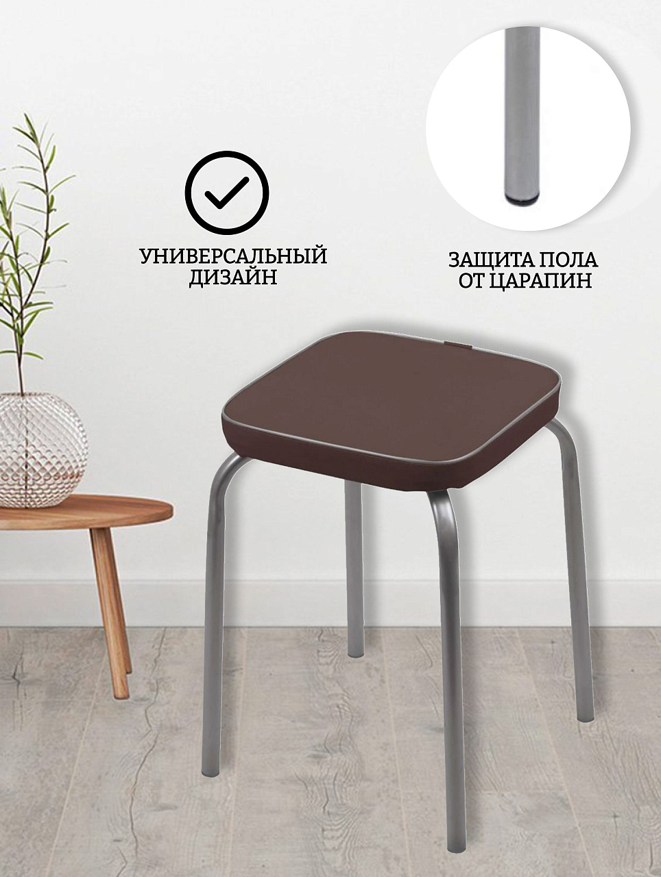 Современные табуреты — отличная альтернатива громоздким стульям. Благодаря своей компактности они гармонично вписываются в интерьер любой кухни. Для обшивки используется искусственная кожа, которая на ощупь практически неотличима от настоящей, но при этом обладает повышенной износоустойчивостью и легкостью в уходе. Опоры покрашены полимерно-порошковой краской, защищающей их от коррозии и имеют специальные пластиковые заглушки, предохраняющие покрытие пола от соприкосновения с металлом.
