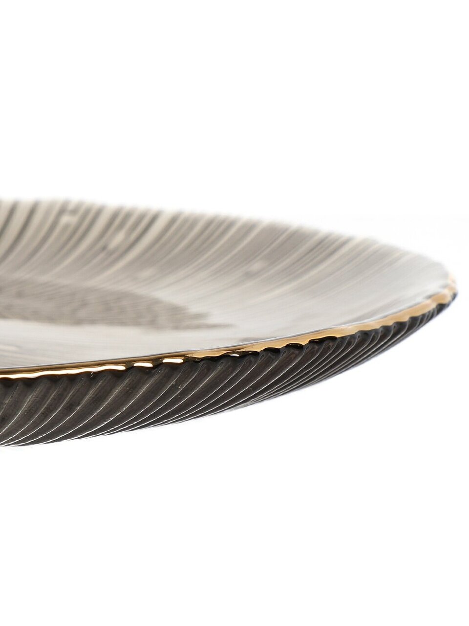 Диаметр — 20 см, форма — круглая, цвет — графитовый с золотой каймой, подходит для сервировки и подачи различных блюд.