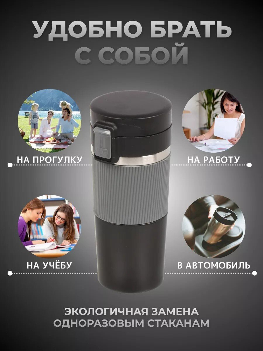 Если вы ищете, как выбрать термокружку для города или для спорта, обратите внимание на сочетание легкости, компактности (0.43 л) и универсального дизайна в черно-серых тонах — она подойдет и мужчинам, и женщинам.