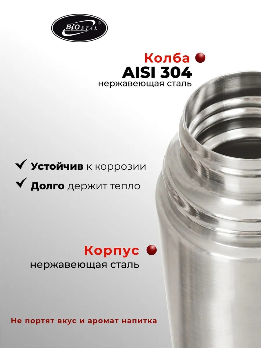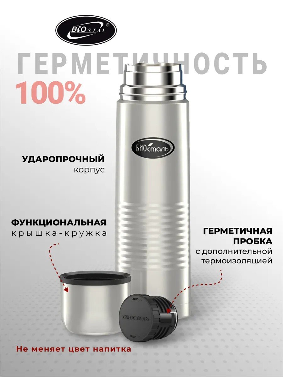 Как использовать термос Biostal? Просто налейте напиток через узкую горловину, плотно закрутите крышку и возьмите с собой — термос легко помещается в рюкзак или автомобильный подстаканник. Серебристый цвет и лаконичный рисунок делают его отличным подарком для мужчин и женщин.