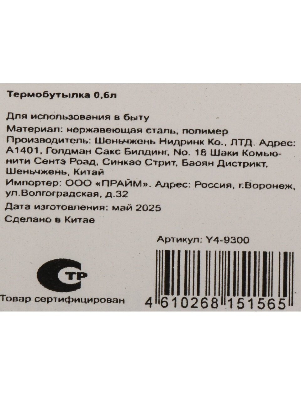Термобутылка из нержавеющей стали 0.6 л — держит напитки горячими и холодными до 12 часов. Оптимальный объём для спорта, города и путешествий.