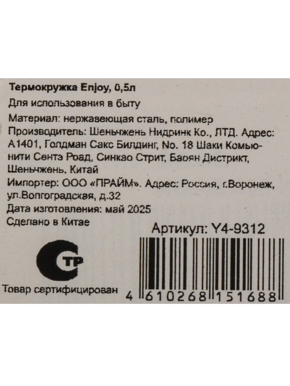 Термокружка из нержавеющей стали Enjoy 0.5 л — сохраняет напитки горячими до 12 часов, удобна для дома, спорта, авто и прогулок. Безопасно, стильно, выгодно!