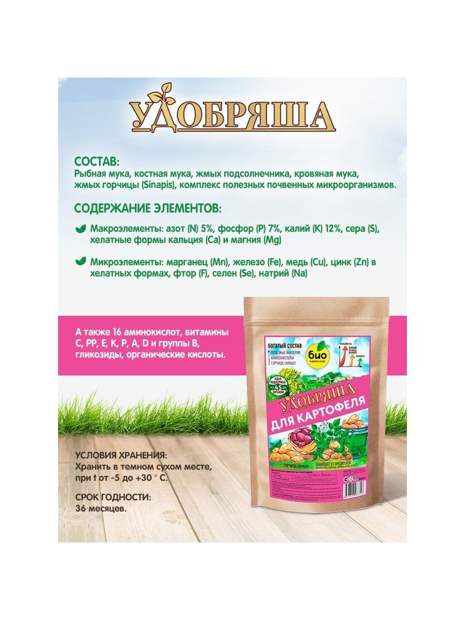 "Удобряша"– это органическое удобрение с аминокислотами и полезными почвенными бактериями. Разработано с учетом всех потребностей культуры в питании и защите от почвенных вредителей.