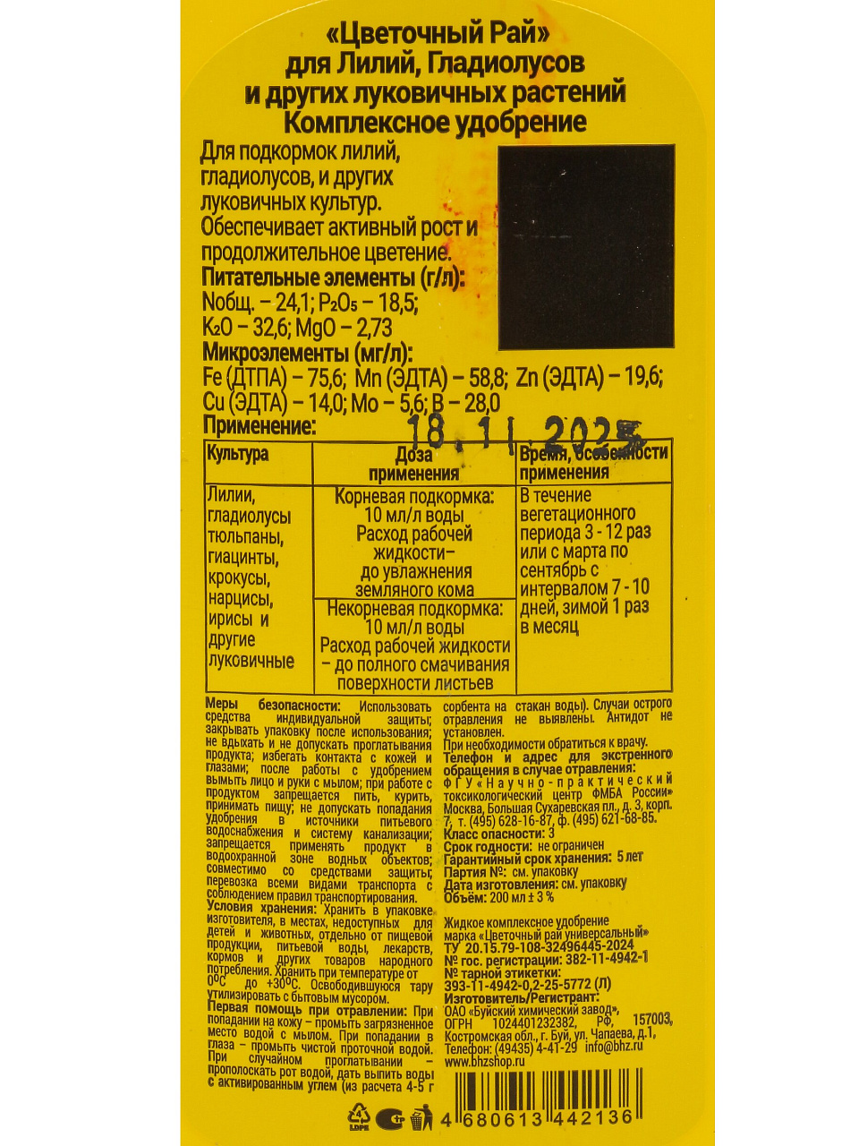 - Уникальная формула: минеральный стимулятор «Цветочный рай» активирует рост и защищает от болезней, подходит для всех луковичных цветов.