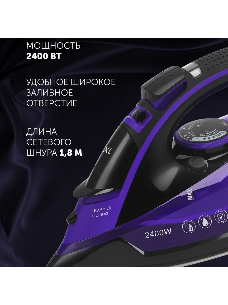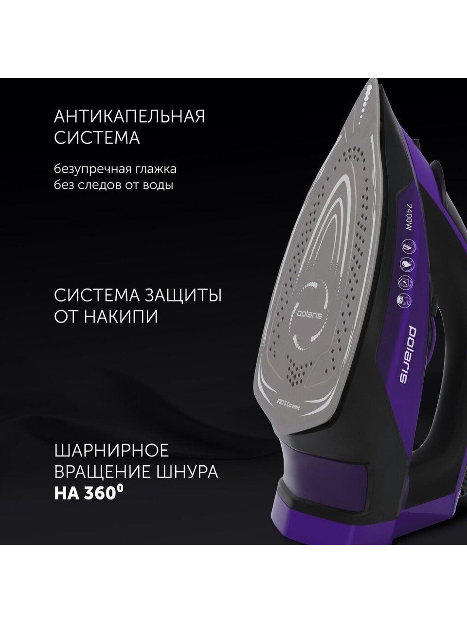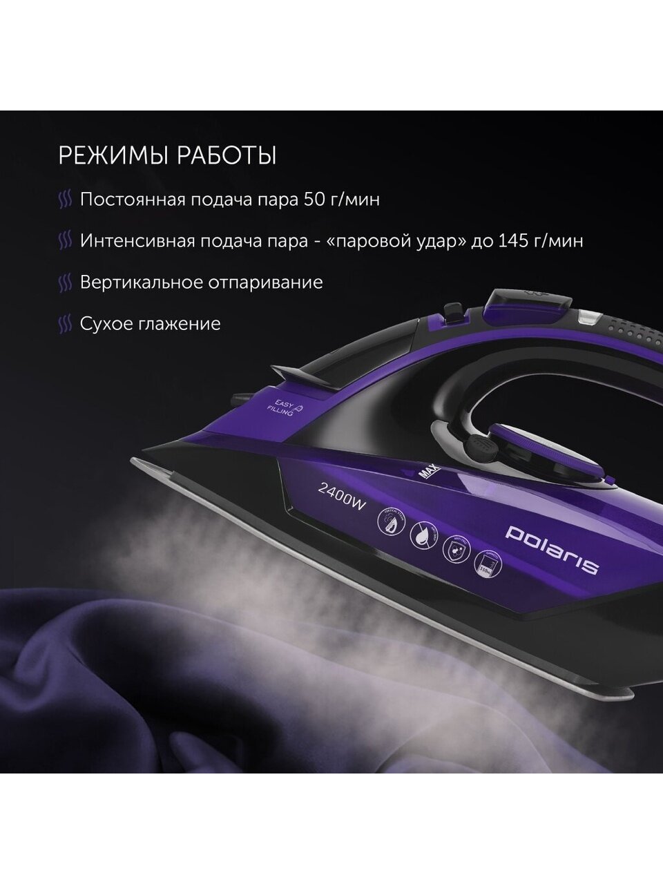 Вы можете приобрести «Утюг Polaris, PIR 2415K, 2400 Вт, керамика, вертикальное отпаривание, противокапельная система, 1.8 м, фиолетовый» и другие товары в нашем интернет-магазине в Тамбове по низким ценам и с бесплатным самовывозом.