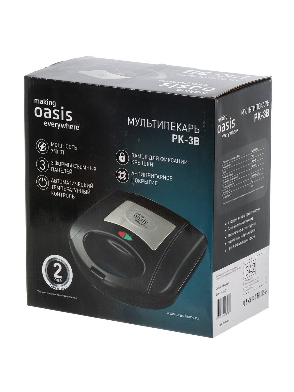 Вы можете приобрести «Мультипекарь Oasis, PK-3B, 750 Вт, 3 вида сменных панелей, черный, антипригарное покрытие» и другие товары в нашем интернет-магазине в Обнинске по низким ценам и с бесплатным самовывозом.