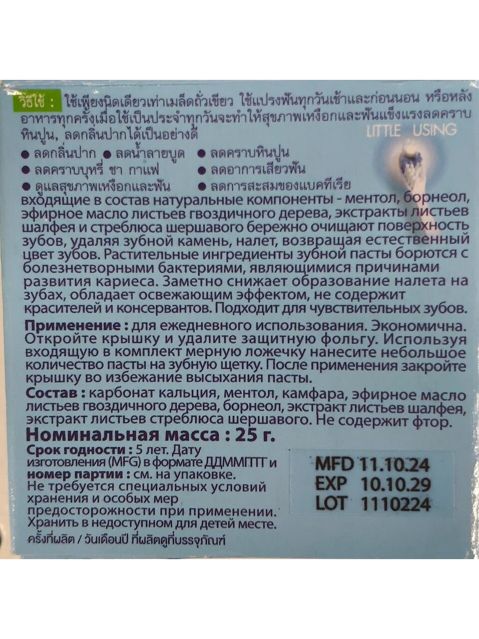 Состав: карбонат кальция, ментол, камфара, эфирное масло листьев гвоздичного дерева, борнеол, экстракт листьев шалфея, экстракт листьев стреблюса шершавого. Не содержит фтор.