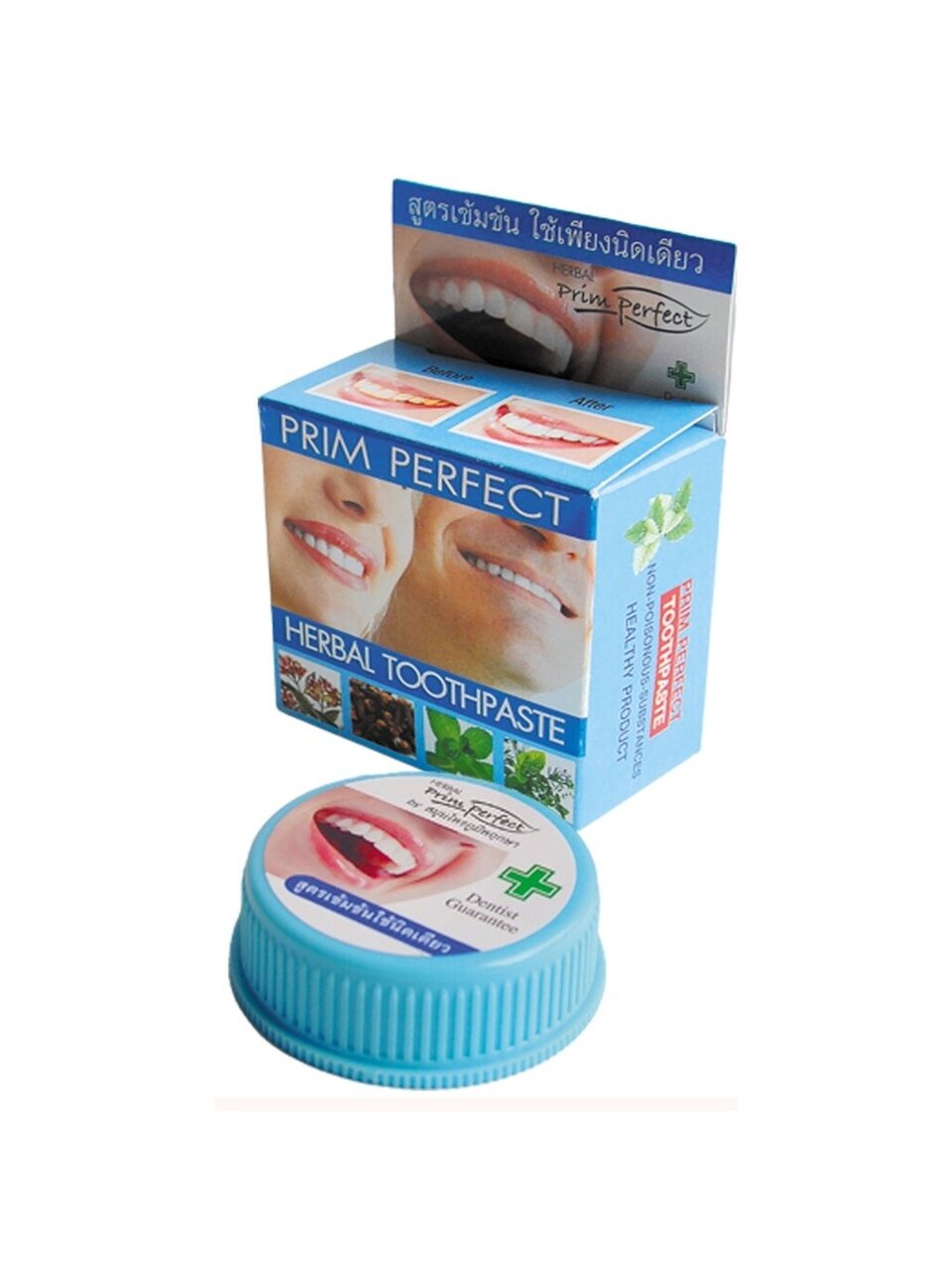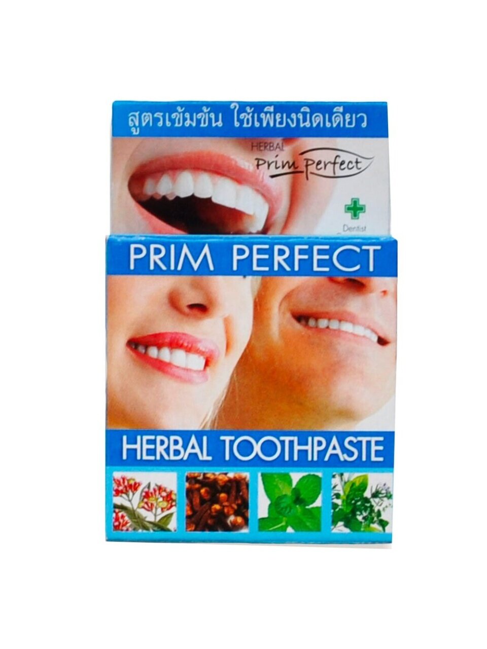 Травяная отбеливающая зубная паста Prim Perfect заботится о полости рта, предотвращает появления кариеса, уменьшает чувствительность зубов, воспаление десен и борется с неприятным запахом благодаря входящим в состав травяным маслам.